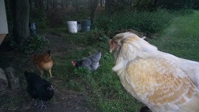 | Esther, on my foot, looking down on Koko, Hazel, and Indigo as the sun goes down |