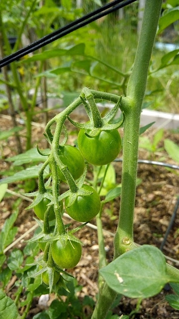 You've already seen this picture of our farthest along grape tomatoes. Today I noticed our first Big Beef tomato as well, but I couldn't get a good picture of it. I've been pruning the tomatoes this year again, taking the suckers off as they form to hopefully direct more energy to the main plant and fruit production, but I missed a couple of suckers that are huge now, and I don't want to take those off, so I guess they get to stay and contribute to the tomato jungle.